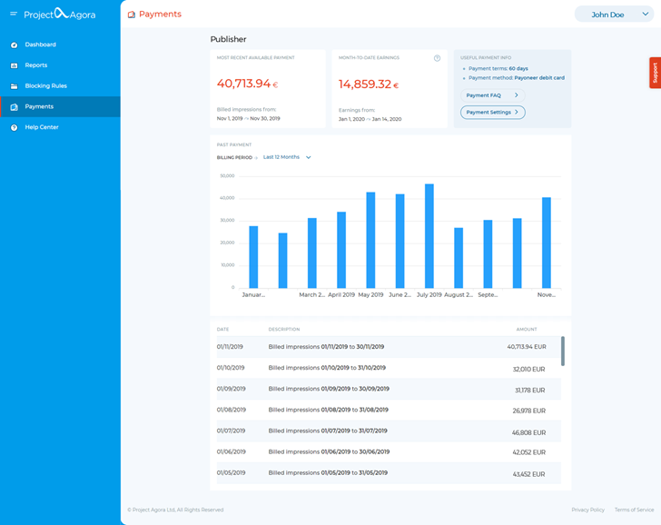 You have real time access to the platform to see your revenue, volumes and CPM from advertisers. You invoice based on the monthly net figure displayed in the PAYMENTS tab of the Publishers UI, after the 5th day of the month.